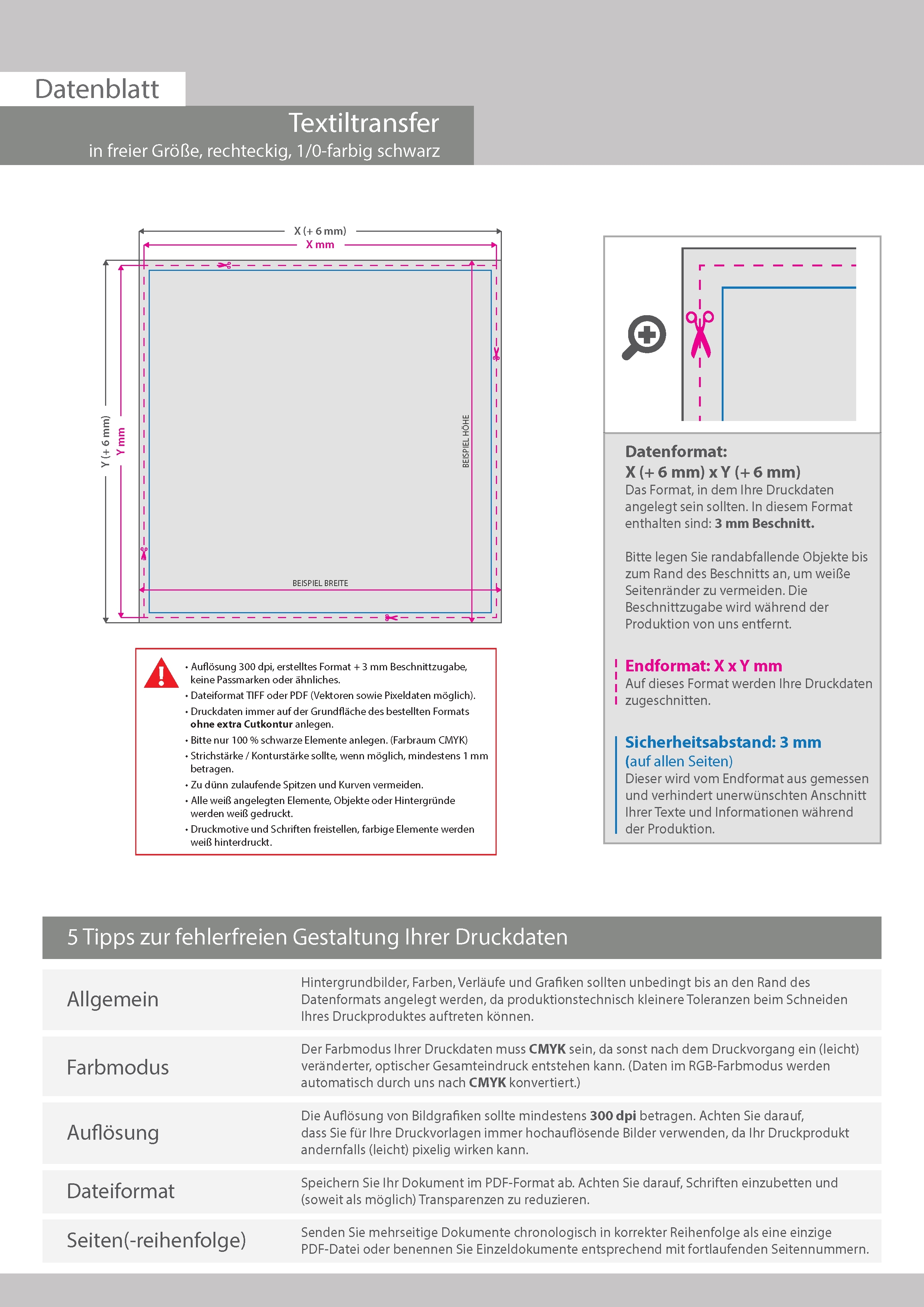Hochwertiger Textiltransfer in freier Größe (rechteckig), einseitig 1/0-farbig (schwarz) bedruckt